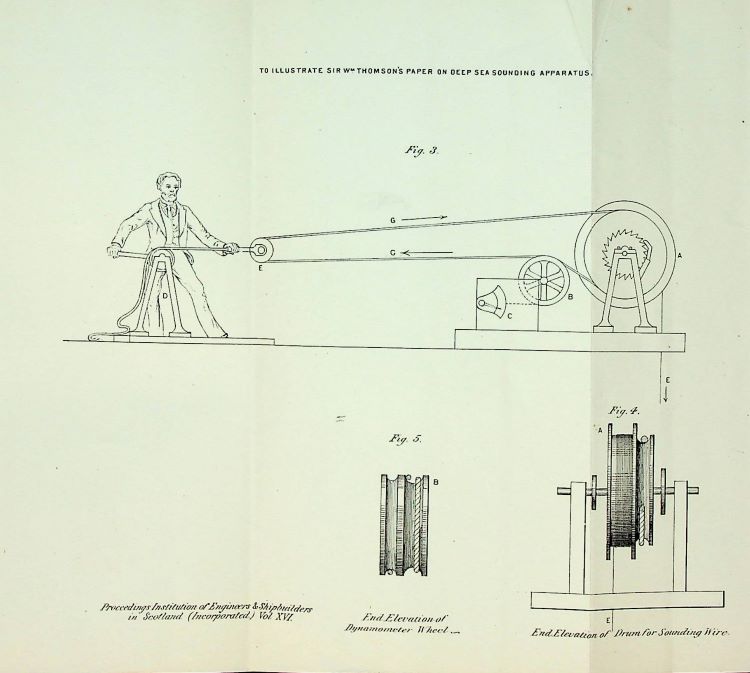 This image is a plate from a series of papers Thomson delivered to the Institution of Engineers and Shipbuilders in Scotland on 13 and 18 March 1873, titled ‘On Signalling through Submarine Cables and on the Rope Dynamometer’. It depicts a rather jaunty sailor operating the mechanism to unwind a cable and gently lay it on the ocean floor. The paper describes Thomson’s own experiences on board one of the vessels that made use of this apparatus; he states that ‘the sailors would not believe that the bottom had been reached until the sinker was brought on board with its brass tube filled with fine oaze [sic]”.1 Although only one operator is depicted in the image, Thomson clarifies in his talk that it would have required at least two people to operate the rope dynamometer in the depths of the ocean.