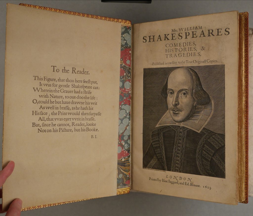 The University Library is very lucky to have copies of all four Shakespeare folios printed in the seventeenth century (1623, 1632, 1664 & 1685). The 1685 fourth folio came to us in 1715 with the books of John Moore, Bishop of Ely, and the first, second and third were bequeathed to us in 1894 by Samuel Sandars, a graduate of Trinity College and collector of early English literature and fine bindings. Sandars is commemorated annually in the readership in bibliography which he endowed. Although not rare in terms of surviving copies (about 230 are recorded), the first folio has long been an iconic book. It contains the earliest surviving texts of some of Shakespeare’s plays and is consequently coveted by collectors. The early history of our copy is not known; its first recorded owner was Nathaniel Philip Simes of Stroud Park, Horsham, by whom it was acquired c. 1850. The present binding, by Francis Bedford, seems likely to have been done for Simes, since Bedford died three years before the sale of Simes’s library.