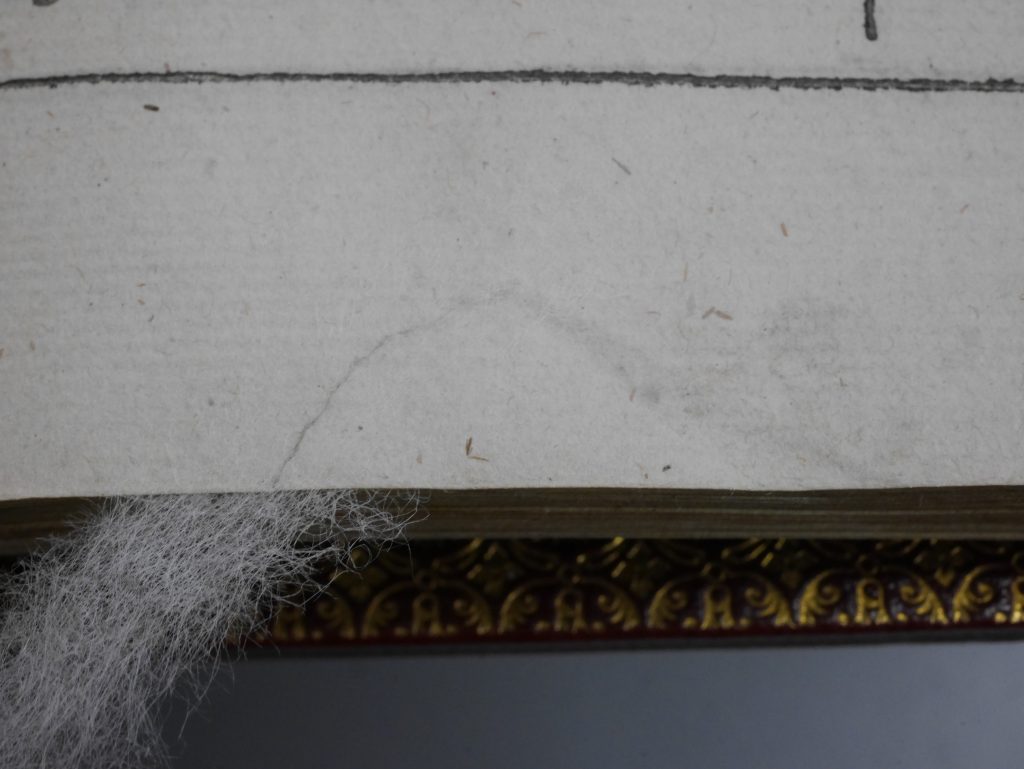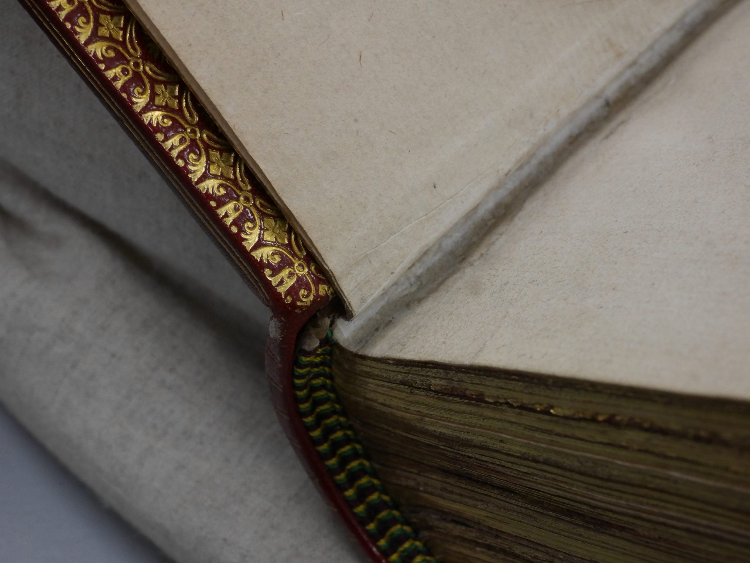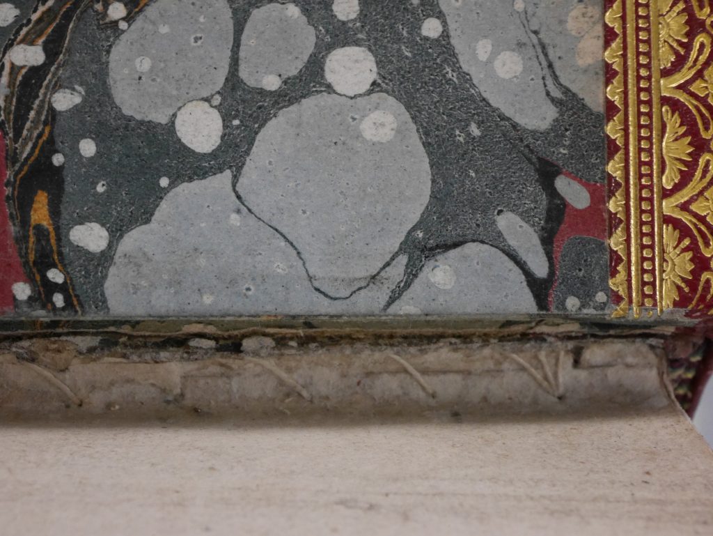 The treatment was as follows. One side of a Japanese paper (Usumino 14gsm) v-hinge was attached to the group of detached leaves (first marbled paper flyleaf, following two paper flyleaves and the first leaf, “To the reader”) with wheat starch paste. The other side of the hinge was pasted into the shoulder of the binding along the inside of the join to reattach the leaves into the binding and integrate them into the rest of the text block. This method allows for the volume to open stress-free at this particular opening. A narrow strip of very fine Japanese paper (Tengu 3.5, toned with acrylic) was pasted to the inside join over the marbled paper pastedown and flyleaf to further consolidate the cracks and tears created when the leaves were detached. Paper tears within the volume were repaired on both sides with a fine Japanese paper (Kozo, KR7 -7gsm) and wheat starch paste.