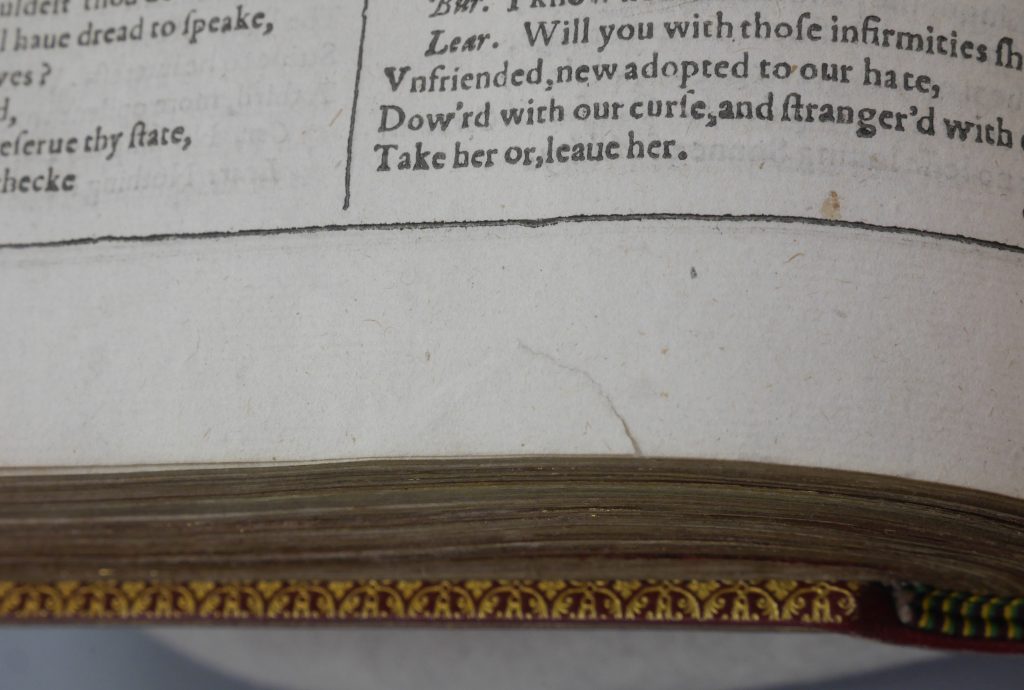 Our copy has in the past frequently been brought out for visitors and displayed at the famous first opening, where Shakespeare’s engraved portrait faces the title page. This led to a weakening of the binding structure, and consequently in recent years the first gathering of leaves and the nineteenth-century marbled paper endleaves have come loose from the binding. In December the book went to our conservation studio for the leaves to be re-attached, and for some small paper repairs to be made at other places within the volume. Deborah Farndell, Senior Conservator, worked on the book, checking its condition throughout before beginning her work. What follows is based on her Condition & Treatment Report.